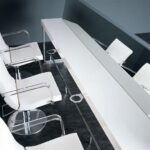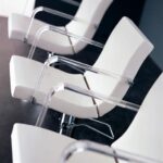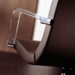 Polyurethane foam frame with metal insert and transparent methacrylate armrests with polished steel hooks